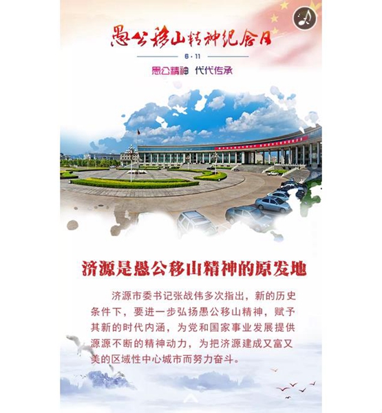 愚公移山精神是中華民族的寶貴精神財富,是黨和人民事業(yè)永續發(fā)展的力量源泉,受到黨和國家領(lǐng)導人的高度重視,成為中國精神、民族精神的代表。2017年濟源將每年的6月11日設立為“愚公移山精神紀念日”,旨在線(xiàn)進(jìn)一步傳承中華民族精神。