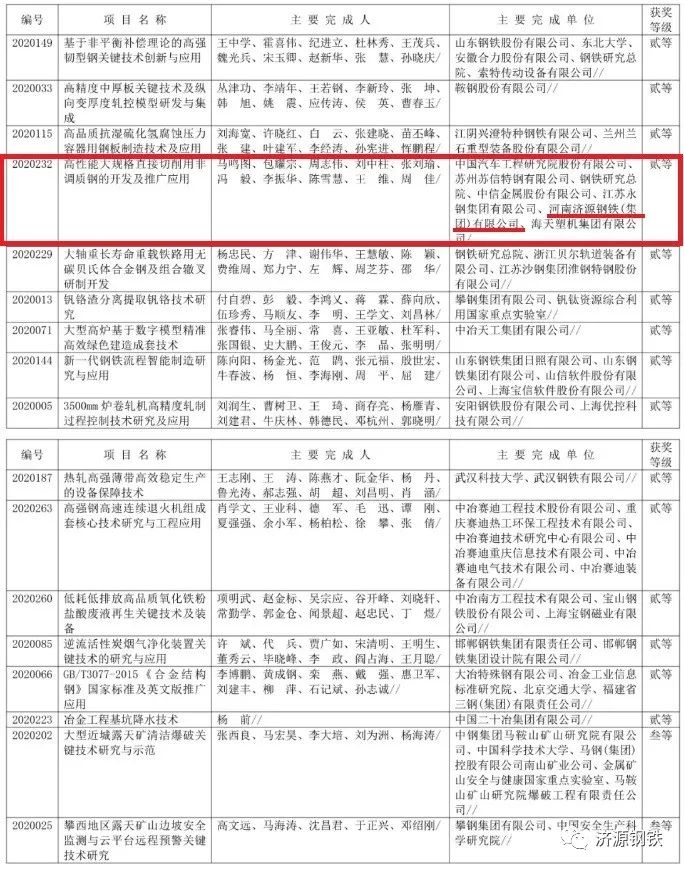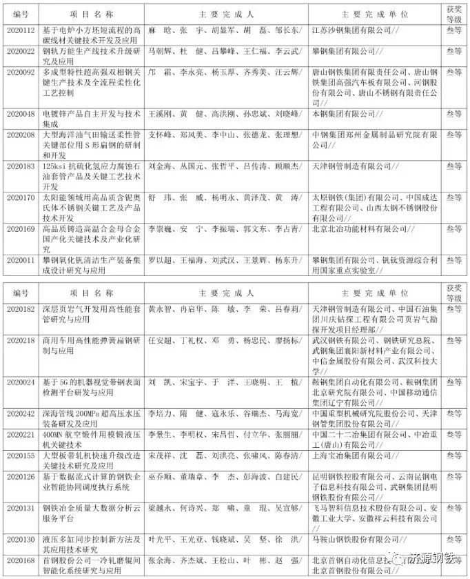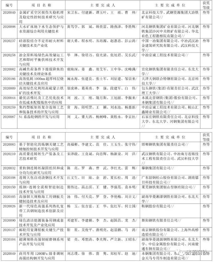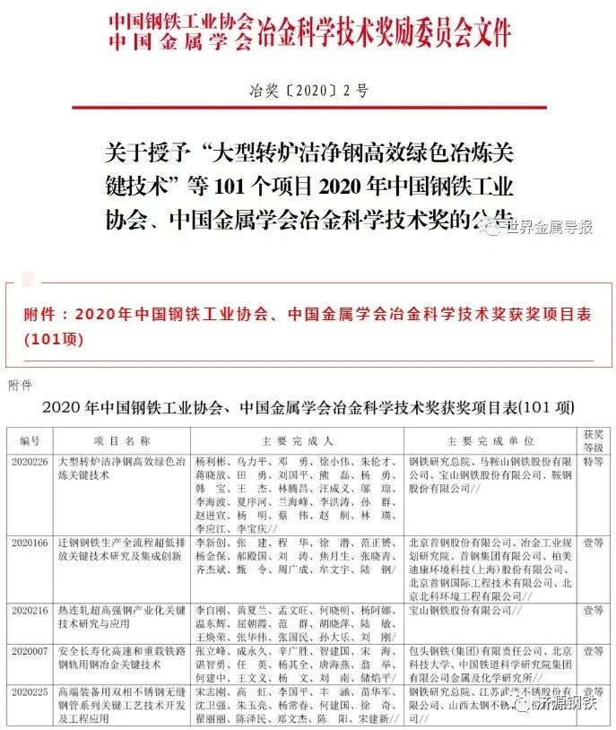 近日,中國鋼鐵工業(yè)協(xié)會(huì )、中國金屬學(xué)會(huì )發(fā)布《關(guān)于授予“大型轉爐潔凈鋼高效綠色冶煉關(guān)鍵技術(shù)”等101個(gè)項目2020年中國鋼鐵工業(yè)協(xié)會(huì )、中國金屬學(xué)會(huì )冶金科學(xué)技術(shù)獎的公告》(下簡(jiǎn)稱(chēng):《公告》),《公告》稱(chēng),按照《中國鋼鐵工業(yè)協(xié)會(huì )、中國金屬學(xué)會(huì )冶金科學(xué)技術(shù)獎獎勵條例》及其《實(shí)施細則》規定,經(jīng)嚴格評審,冶金科學(xué)技術(shù)獎獎勵委員會(huì )決定對101個(gè)項目授予2020年中國鋼鐵工業(yè)協(xié)會(huì )、中國金屬學(xué)會(huì )冶金科學(xué)技術(shù)獎。